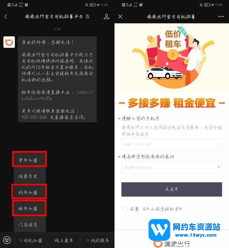 无车加盟:点击租车/购车加入,填写资料,等待工作人员联系。要注意租车和买车都是一件大事,不要轻易签写合同,要仔细查看规则,以免被坑骗。