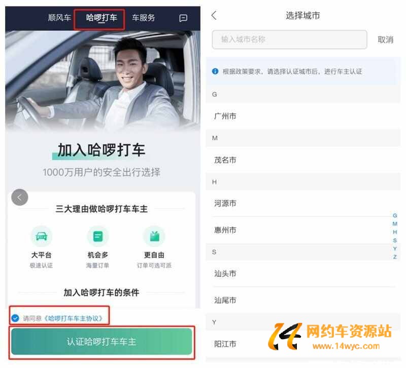 2、进入车主注册界面后,点击上方的“哈啰打车”字样,此时会出现哈罗打车注册司机的相关要求,点击下方的“认证哈啰打车车主”按键,选择跑网约车业务的城市;
